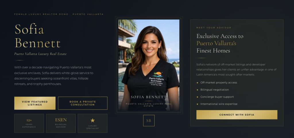 I built a demo site to show exactly what is possible when you have a professional branded website working for you 24 hours a day. The fictional agent is named Sofia Bennett. She is not real. But everything on that site can be built for you — your name, your face, your listings, your story, and your contact information. Plus a full done-for-you content system so you launch ready to go from day one.