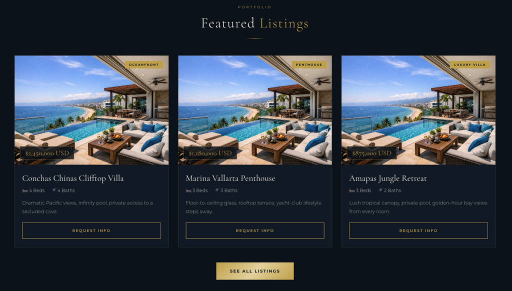 - Featured properties with photos, pricing, and bedroom and bathroom details